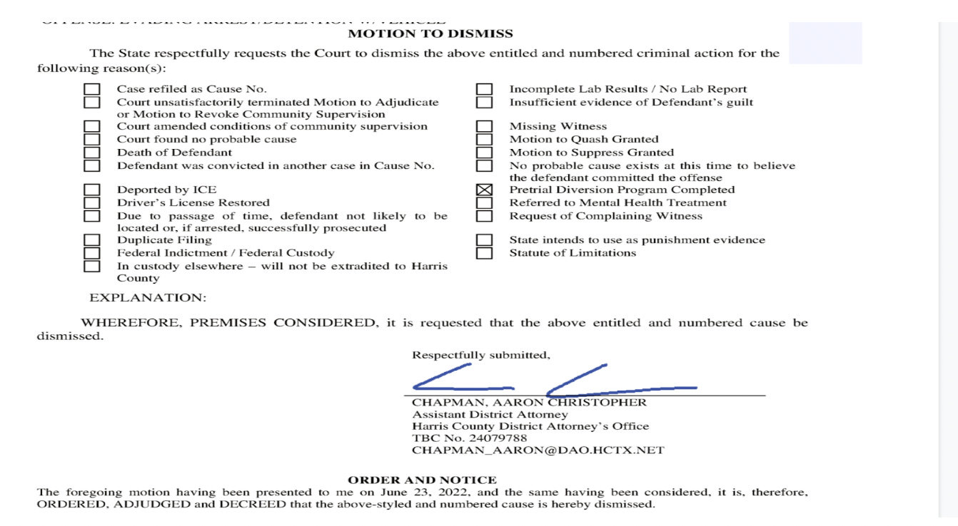 Just three weeks after Ms. Mankarious’s follow-up email to D.A. Ogg, the Harris County District Attorney’s Office filed a motion to dismiss the charges in the felony case, citing the fact that the au pair had “completed” a “pretrial diversion program.”