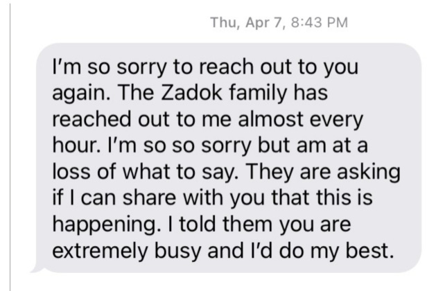 But other than Jonathan Zadok’s nanny, almost no one has a person willing to repeatedly badger the elected District Attorney on their behalf. But that’s just what Ms. Mankarious did at the persistent urging of Mr. Zadok. Here’s the text she sent to D.A. Ogg just five hours after the first message: