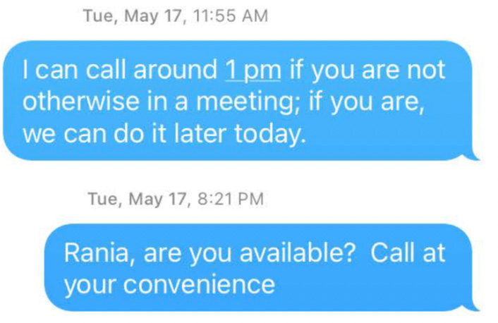 Ogg and Mankarious connected by phone on May 17th, following at least three texts from Ogg attempting to pin down a time to chat: