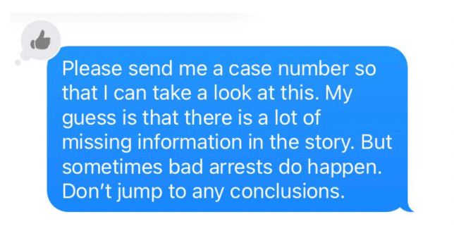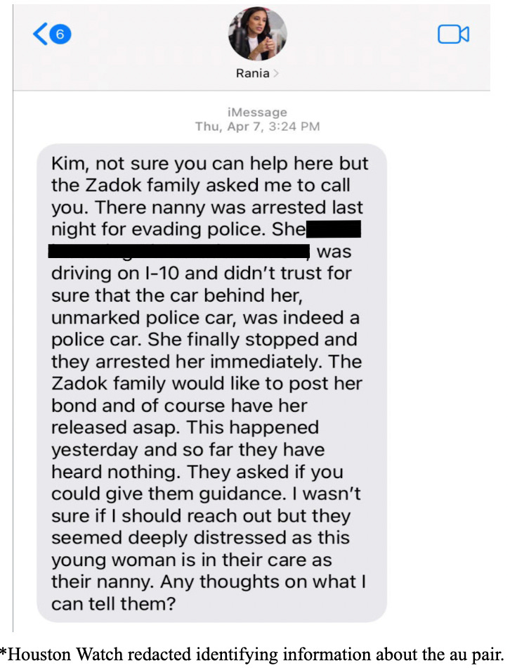 The day after the au pair’s arrest, Ms. Mankarious sent a text message to D.A. Ogg, explaining that the Zadok’s “nanny was arrested last night for evading the police” and the “Zadok family asked me to call you” to see “if you could give them guidance.” Mankarious explained that the Zadok family wanted to “of course have her released asap.” Ogg asked Mankarious to “please send me a case number so I could take a look at this.”