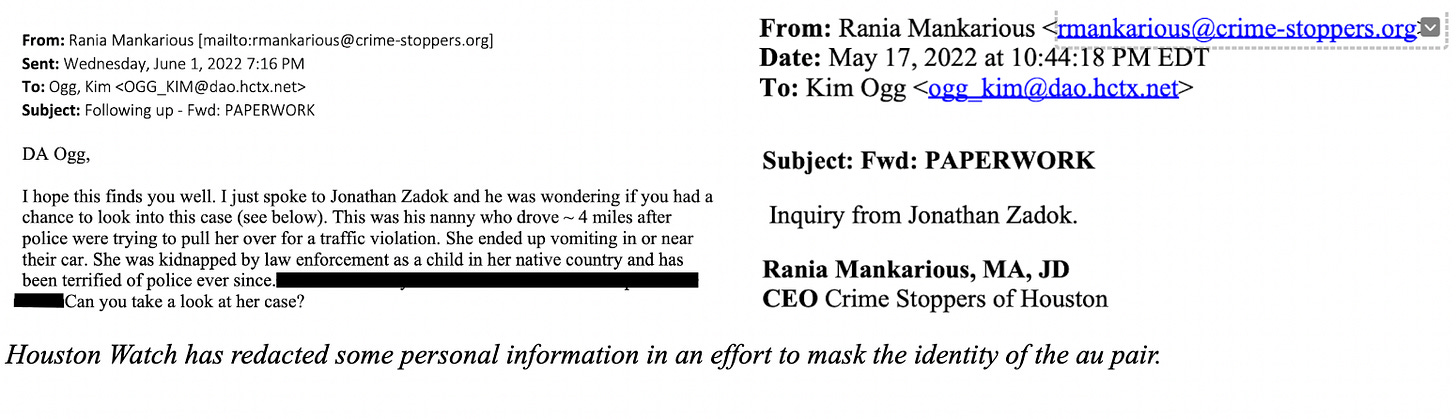 That’s the cryptic text contained in a May 17th, 2022 email from Ms. Mankarious to District Attorney Ogg. The email contains a forwarded email from Zadok to Mankarious with the text “information on the case for our Au pair to pass along,” the cause number, and a reminder that “Ogg can access” the “full package of explanations” into his nanny’s behavior through the online court docket. Mankarious fired off this email to Ogg just three weeks after a grand jury returned an indictment against the au pair on felony evading the police charges.