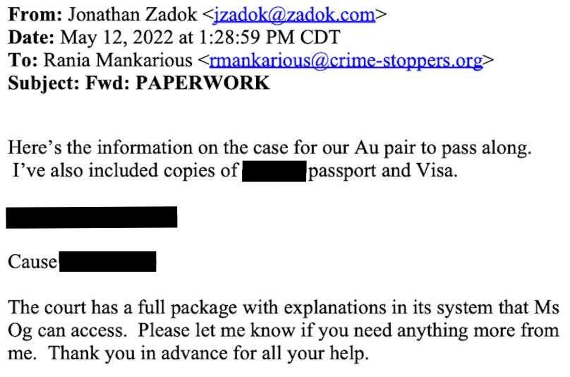 Ms. Mankarious again texted Ogg on May 12th: “Do you have time for a call tonight? I have just one question if you have time.” Ogg didn’t respond to this text, but emails obtained by Houston Watch reveal why Rania reached out on the 12th. Earlier that day, Mr. Zadok emailed “information on the case from our au pair to pass along” and referenced other relevant information that “Ms. Og[g] can access.”