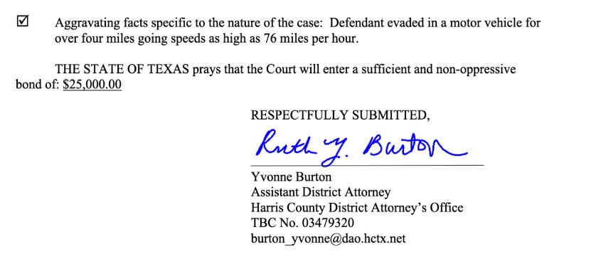 Evading the police is a serious charge. In Harris County, it is not unusual for a person to be sentenced to a multi-year prison term after a felony evasion conviction. That’s why the assistant district attorney assigned to the au pair’s case asked the judge to hold the woman in jail unless she could pay a $25,000 bond.